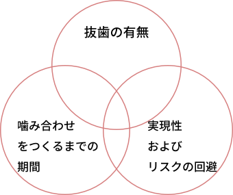 患者様は特に重要視したい要素(抜歯の有無、噛み合わせ)と、当院からは、歯の移動における予測実現性の観点からアドバイスをさせていただきながら、患者様が主体性をもって治療計画をお選びいただき、モチベーションを持って、治療に臨んでいただけるかと思います。